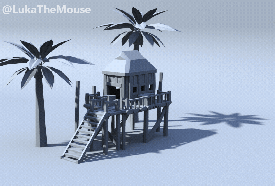 Then I began creating the house platform, walls, stairs, and railings and then placed it on the island. I added all kind of details around to give it more life (rocks, palmtrees, plants…).